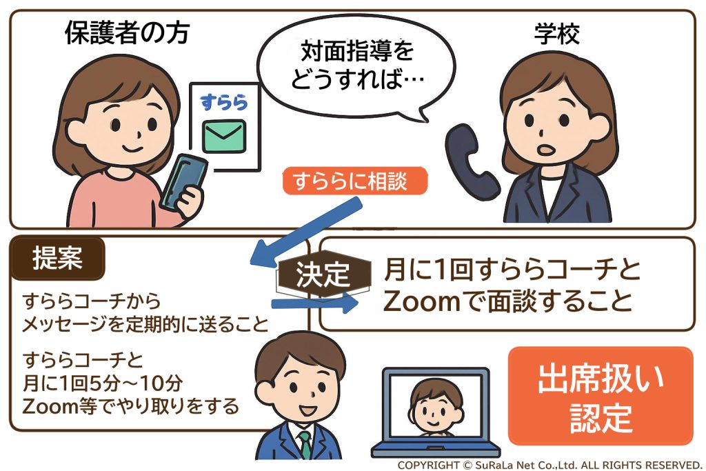 学校側の理想は先生と電話やZoomで2週間に1回話をすることを面談にしたいとのことでしたが、お子さまは先生と話すことが難しかったため、「すらら」の出席扱い担当者はすららコーチと相談することにしました。そして、「すららコーチの先生からメッセージを定期的に送ること」や「すららコーチと月に1回5分~10分Zoom等でのやり取りをする」などのご提案をしながら条件決定までの橋渡しをしたところ、「月に1回すららコーチとZoomで面談すること」が決定し、出席扱い認定となりました。
