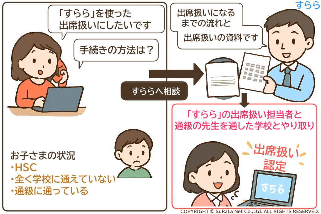 保護者さまから「すらら」のカスタマーセンターへ、「すらら」を使った出席扱いにしたいので手続きはどのようにすればよいか、ご相談をいただきました。お子さまはHSCで全く学校に通えていない状況で、小学校、中学校とも通級に通っていますが、中学校ではHSCに対する理解があまりないように感じられているとのことです。