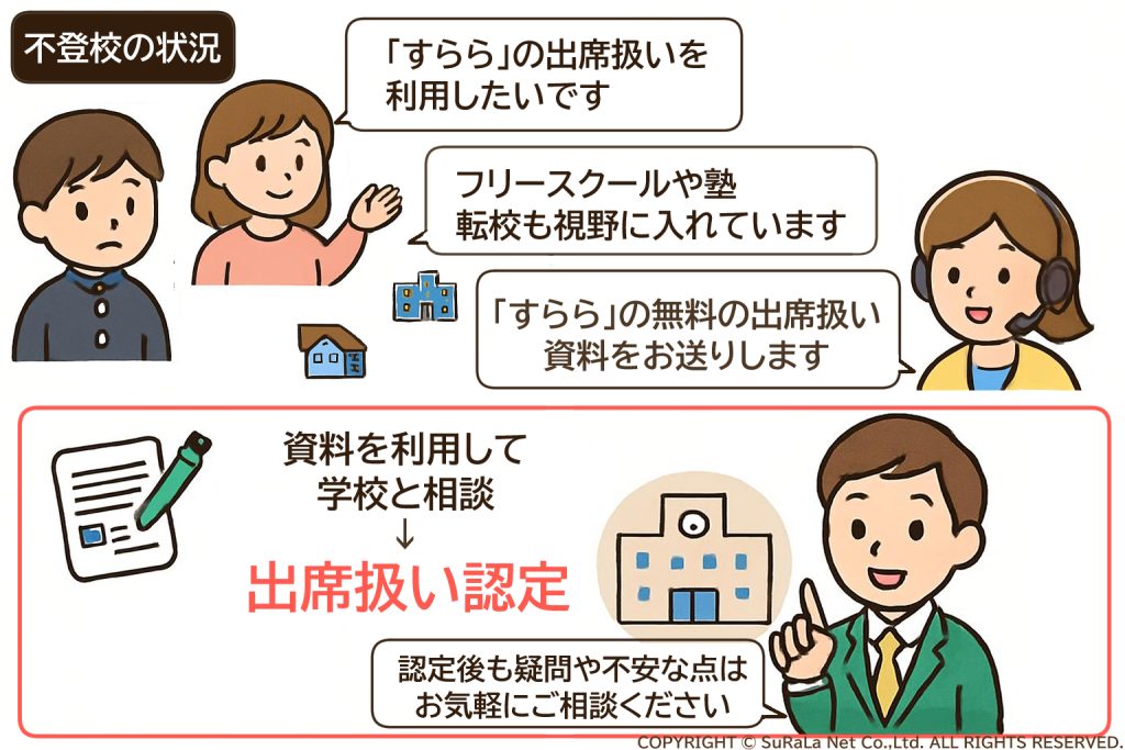 【ポイント】無料でお送りする「すらら」の出席扱い資料一式の活用で、学校との話し合いがしやすく出席扱い認定がスムーズに!