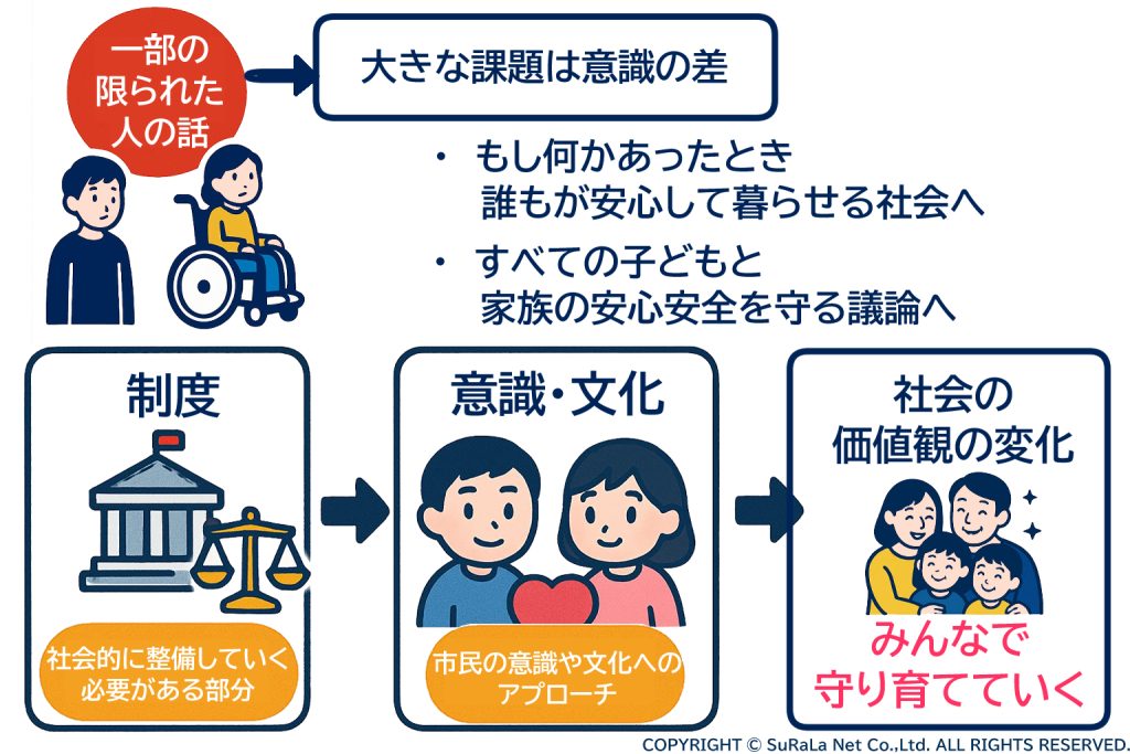 「みんなで守り育てていく」という社会の価値観の変化が、制度にも良い影響を与えていくと信じています。私たちは、両面からのアプローチが必要だと考えています。