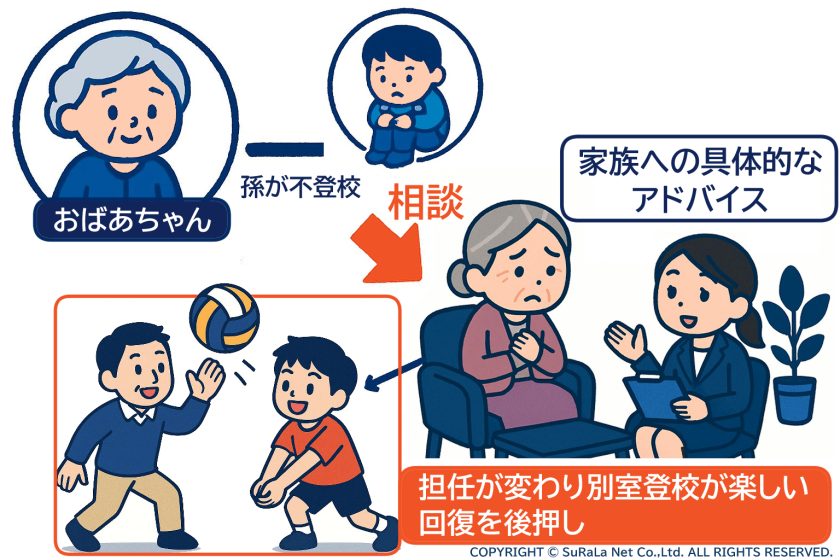 木下:これは先ほどの方と隣り合うような、少し違うタイプのケースなんですが…親がネグレクトしているわけではない。でも、自分の仕事と生活で精いっぱい。そういうご家庭で、孫が不登校になっていて、おばあちゃんが相談に来られるケースです。この「おばあちゃん」が出てくるケース、けっこうあるんですよ。おばあちゃんが孫の世話もして、経済的にも協力していてたり。でも、我が子とその配偶者(親)がなかなか前面に出てこない。こだわりが強くて、「今、自分たちは仕事をがんばってるから、子育てまでは無理。おばあちゃん、お願い」みたいな状況。そうやっておばあちゃんがすべてを背負っている家庭もあります。おばあちゃんはやっぱりキーパーソンなんです。長男が不登校になり、下も次々と不登校…というケースもありました。