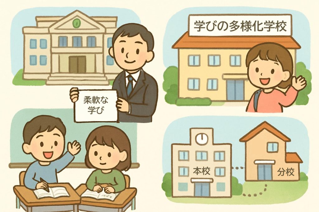 「学びの多様化学校」の中には、学校そのものが学びの多様化学校として指定されている「学校型」と、既存の本校と分離した分校を学びの多様化学校として指定する「分校型」があります。
