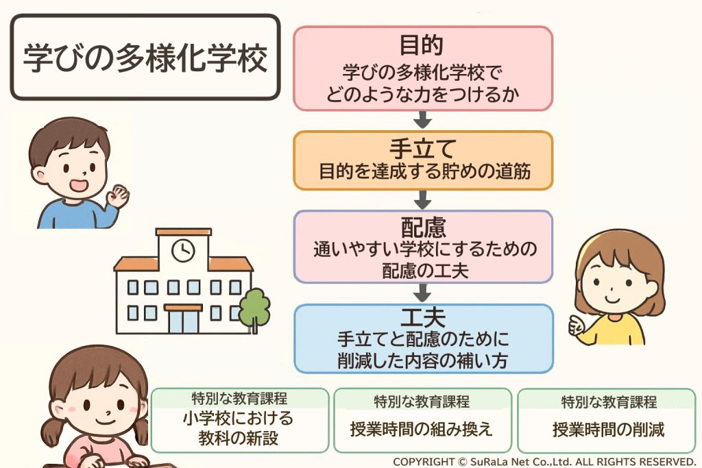 これらの目的は、不登校の子どもが学校に通いやすいよう、学習指導、進路指導、生活指導など、学校のさまざまな側面を柔軟にすることで、学びの選択肢を広げることです。そして、その核となるのが「学びの多様化」です。これは、子どものペースや関心に寄り添った学びを実現し、「個別最適な学び」と、他者との対話や協働を通じて関係性を築く「協働的な学び」を両立させることを目指しています。