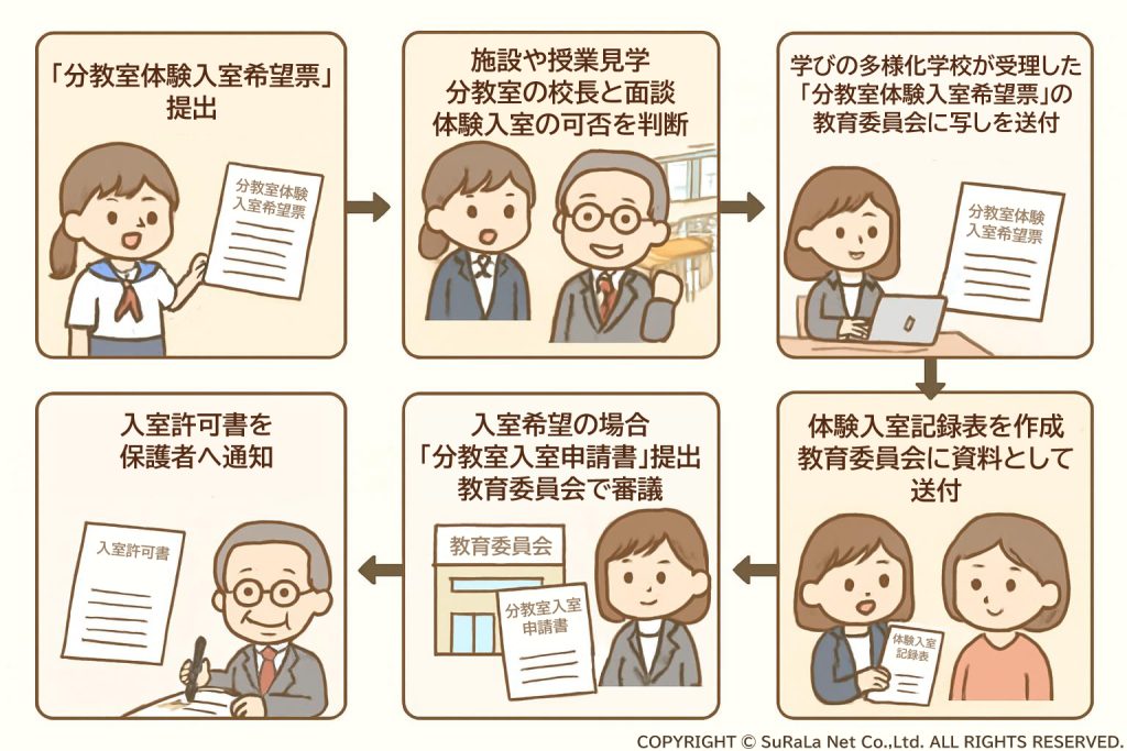 学びの多様化学校に入学・入室するには、在籍校を通じて「分教室体験入室希望表」を提出する必要があります。その後、体験を経て、公立の場合は教育委員会が 入学・入室の可否を決定します。