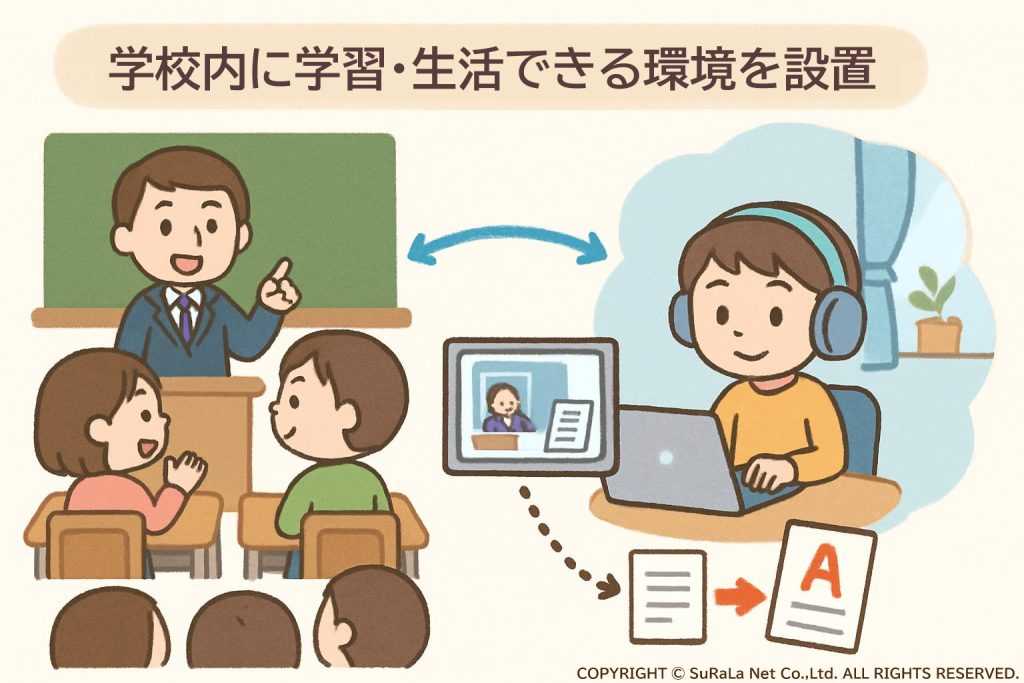 支援の中核は、居場所づくりと学習保障です。GIGA端末などを活用し、別室でも学びを途切れさせないことが、お子さまの自信の回復につながります。