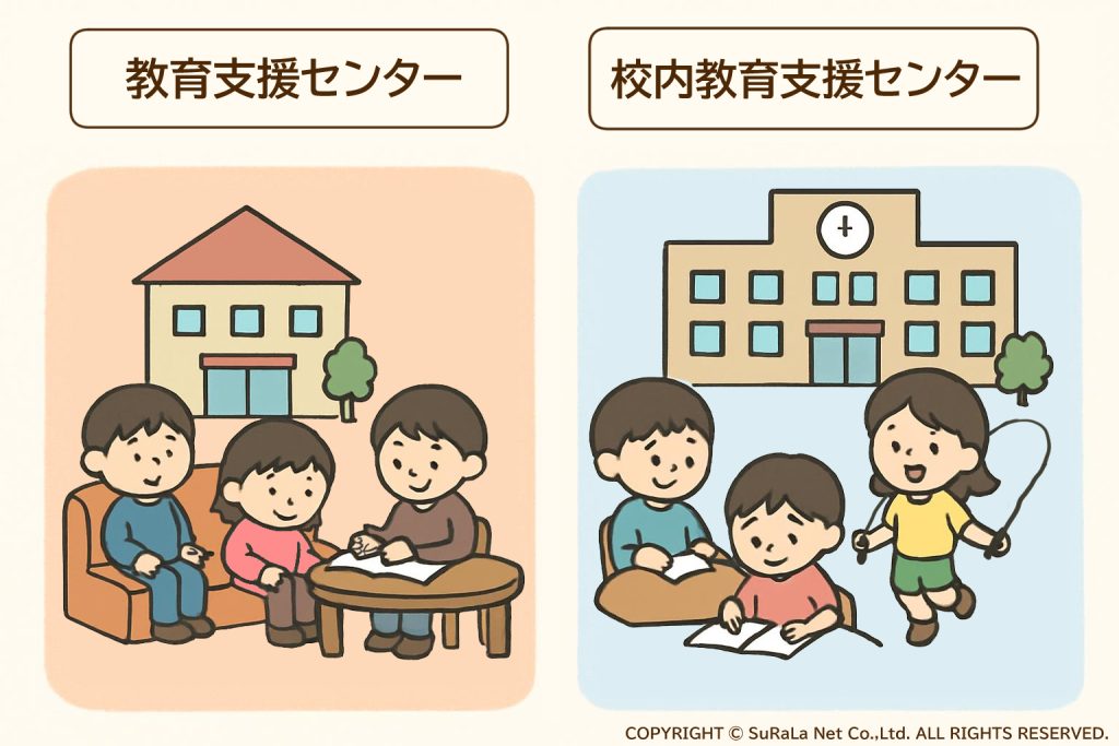 教育支援センターと校内教育支援センターは、どちらも不登校のお子さまを支えるために自治体が行う公的な支援ですが、次のような点が異なります。