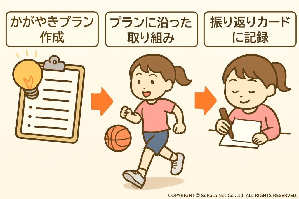 ■かがやきプランの作成→プランに沿った取り組み→振り返りカードに記録