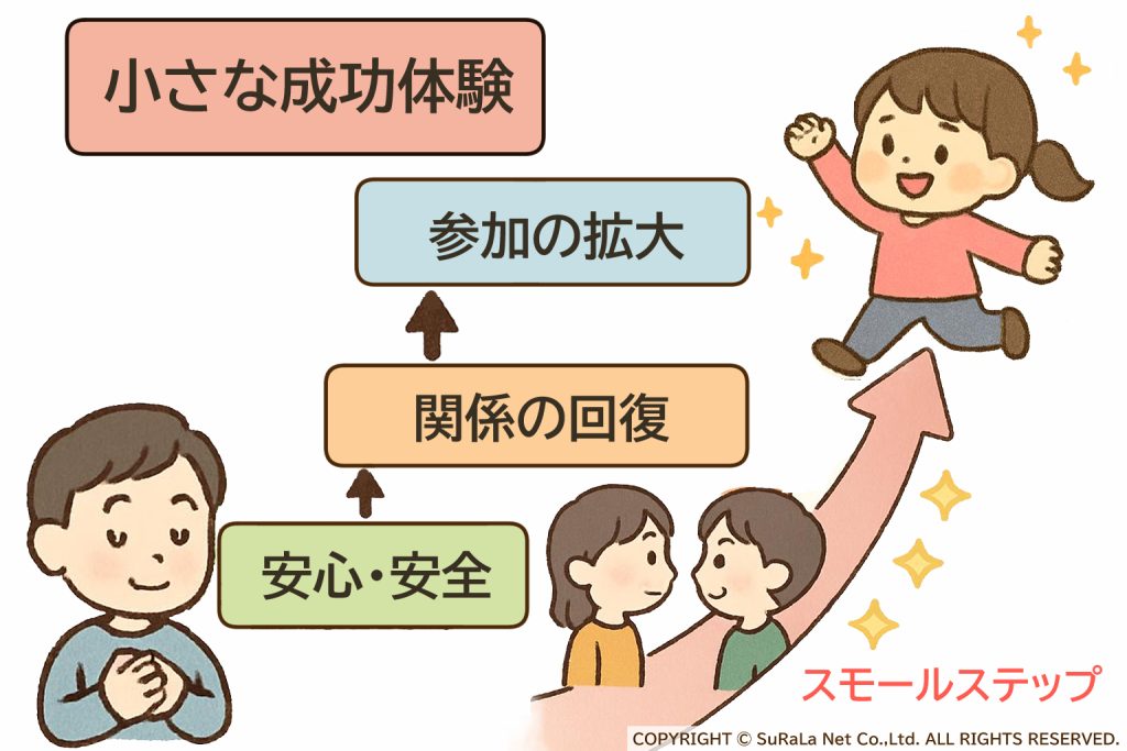 だからこそ、焦らずに「安全・安心」→「関係の回復」→「参加の拡大」という順番を大切にし、小さな成功体験を積み上げるスモールステップがとても重要です。