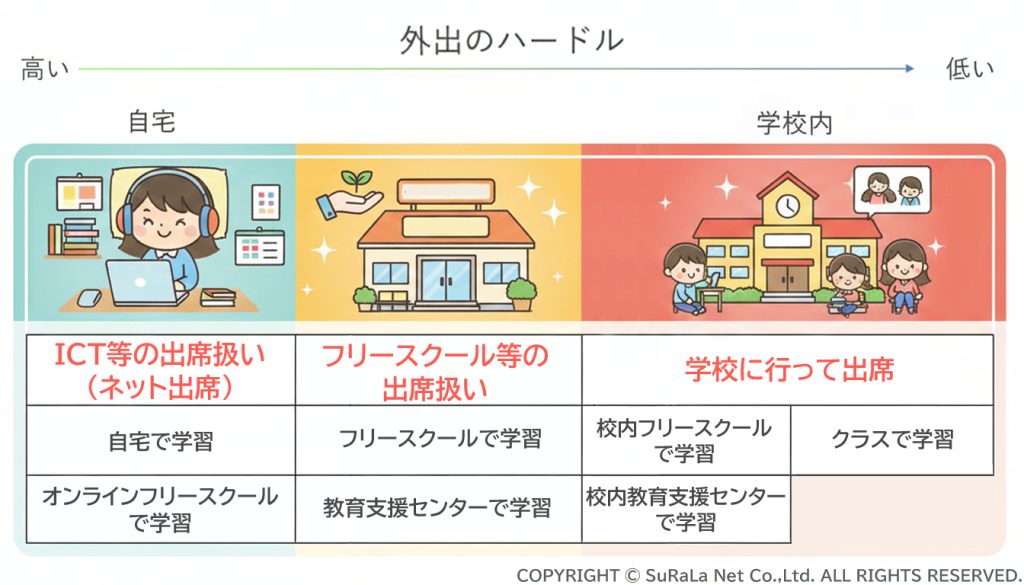 ここまで、不登校児童生徒の増加という現状と、それを背景に加速する「出席扱い」制度の多様化について解説してきました。どのような制度を利用するかを検討するとき、まずは子どもの外出へのハードルが高いか低いかを確認することがおすすめです。