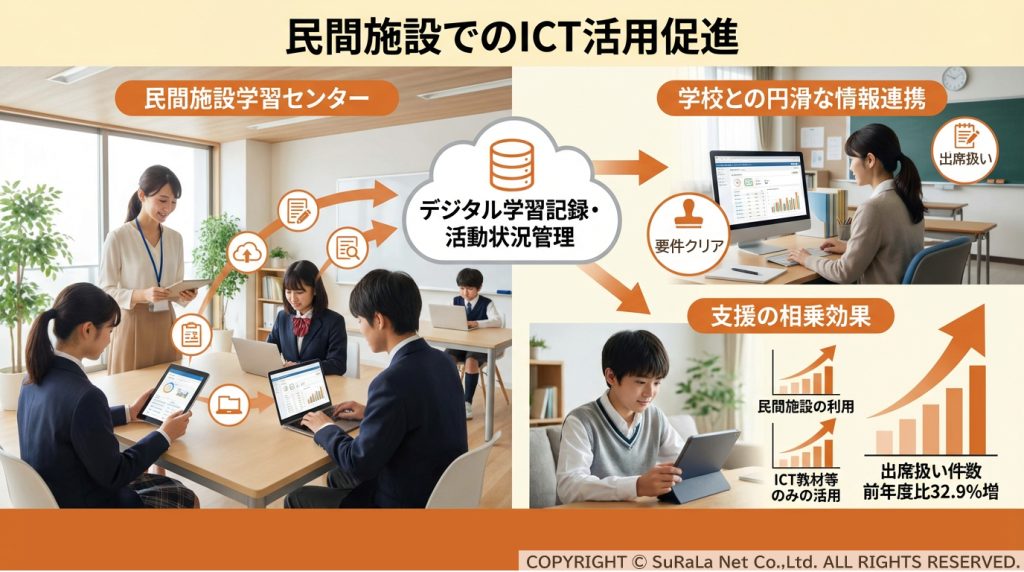 この結果の中でも、民間団体による出席扱いが前年度比32.9%増と、最も高い増加率を示している点に注目が必要です。その背景には、民間施設におけるICT活用が促進されているという状況があります。