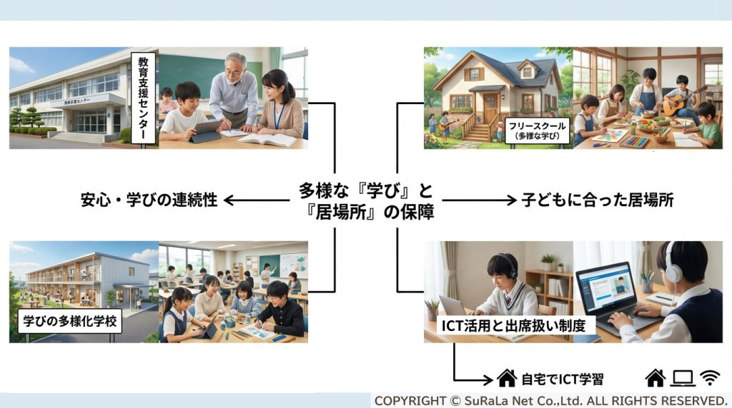 - 期待できること: これらの選択肢は「在籍校に戻る」だけではない、子どもの心や止まっている学習への「回復ルート」を提供