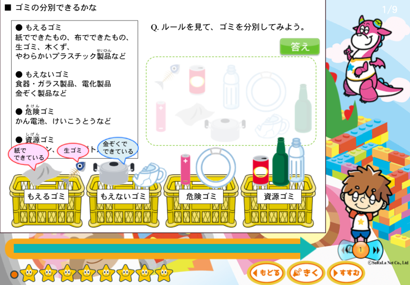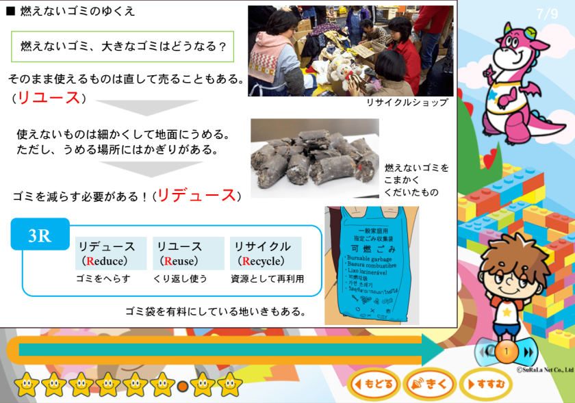 地理分野では、ゴミやSDGsといった身近で興味が持ちやすいテーマから出発し、クイズや会話形式で知識を自分の生活と結びつけて学びます。