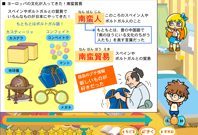 そして、社会は用語や歴史的な出来事の暗記をすればよいと考えがちな科目ですが、すらら社会 小学生版では、キーワードと実際の事象、出来事の背景や流れを「ストーリー」として体感しながら覚えることを重視しています。たとえば富岡製糸場のレクチャーでは、「そこで何が作られているか」をオリジナルイラストや写真で丁寧に解説し、歴史の流れ上でその重要性・現代との関わりまで一貫してイメージできるようにしています。