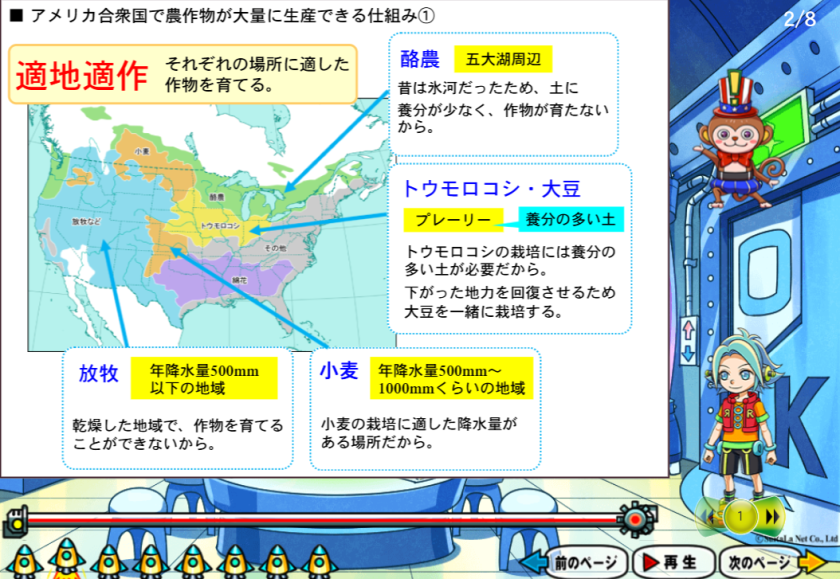 地理分野では、教科書の「文字中心で情報が分断されがち」だった課題に着目し、視覚的なインターフェースで「知識・資料・地図・図表」が一画面でまとまり、全体像が瞬時につかめるようビジュアル重視で構築しています。北アメリカの農業であれば「どんな作物がどこでどう作られているか」「なぜその場所なのか」まで図解と映像で直感的に理解できます。