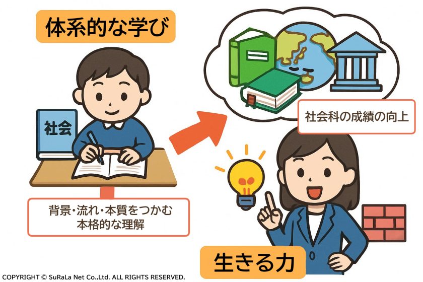 このため、知識を体系的に結びつけていく学びや、背景・流れ・本質をつかむ本格的な理解が、今後ますます重要性を増していくと予想されます。こうした力は、社会科の成績の向上だけでなく、社会に出たときに直面する課題を自分で発見し、解決策を考えるための『生きる力』へと直結します。その意味で、現代の社会科目は、未来の社会で活躍するための基礎力を培う場となっているのです。