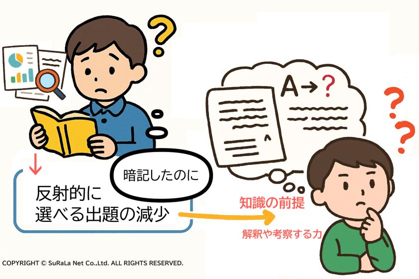 この傾向は高校入試のみならず、大学入学共通テスト(旧センター試験)においても多く見受けられます。長い文章を読解し、資料やグラフをもとに自分で考え抜いて答える複合的な出題が増えているため、単なる単語暗記や断片情報の知識では太刀打ちできなくなっています。