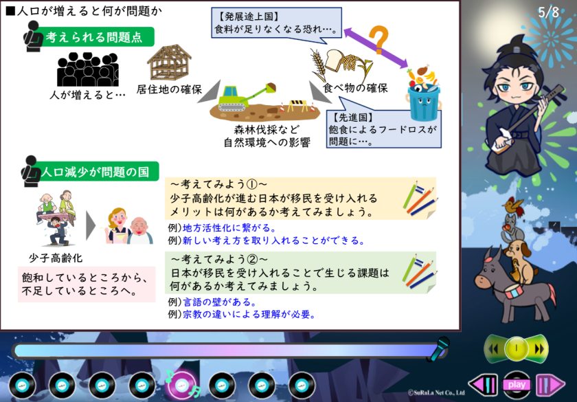 地理総合では写真やデータ、地図を組み合わせて世界の動きや日本の立場を視覚的・論理的に理解する仕組みを導入し、歴史総合では、細切れに覚えがちだった歴史用語を近代・現代の視点で通して学習できるインタラクティブなストーリー展開を特徴としています。また、公共分野では日常生活との接点(例:SDGs・パリ協定・エネルギー問題・人口問題等)を意識的に取り入れ、生徒が自分自身と社会の仕組みを関連づけて考えられるような問いかけ型・体験型学習コンテンツが豊富に盛り込まれています。