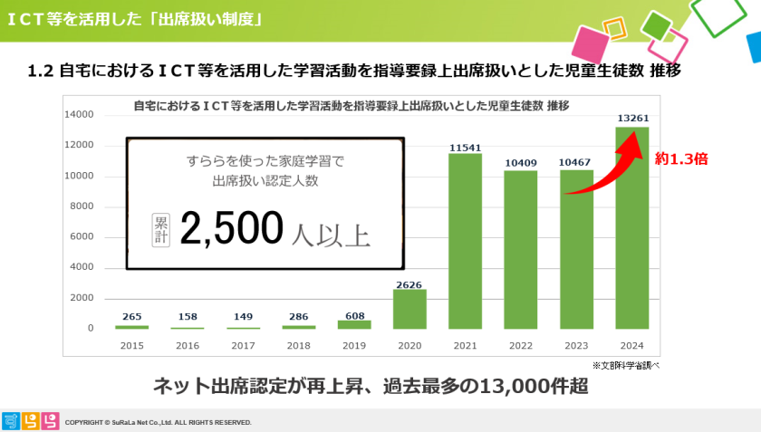 「すらら」では、このICTを使った出席扱い制度を通称:「ネット出席」と称しており、外出が難しい小・中学校の不登校生を対象に出席認定するという、他の出席扱いとは一線を画する新たな選択肢だと考えております。すららでは、ICTによる出席制度(ネット出席)の認知度を高めるべく、2015年から啓蒙活動を行っております。