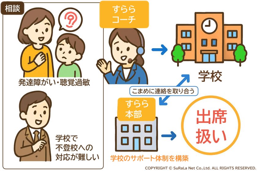 保護者さまから、「すらら」を利用されているお子さまが発達障がいで聴覚過敏であること、学校で不登校生への対応が難しいという相談をすららコーチが受け、すらら本部に共有し出席扱い認定へのサポートを行うことになりました。