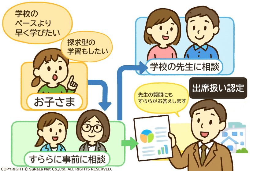 お子さまから学校の授業のペースより早く学びたい、さらに探求型の学習をしたいという希望があり、保護者さまが学校に相談へ行く前にすららコーチやすらら本部に事前に相談をしてくださいました。学校へ説明する際に、すららが用意している説明用の資料を持って学校に相談していただくようにサポートを行いました。