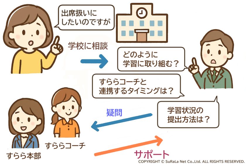 学校の先生から「どのように学習に取り組むか」などの質問がありましたが、保護者の方が回答をする際にすらら本部がサポートすることで、先生の疑問点が解消され、出席扱い制度を進めることができました。