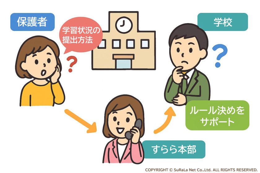 保護者の方から学校へ相談はしていただいており、認定後に「学習状況の提出方法」などご不安に思っていることがあり、すららコーチやすらら本部へ相談をしてくださいました。