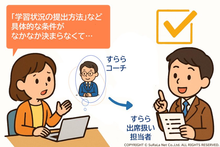 すららの出席扱い担当者が、過去の事例などをもとに出席扱いの条件を決めるサポートをしたことで、先生の疑問点が解消され、出席扱い認定の条件の決定となりました。