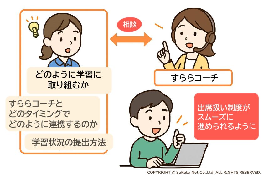 「すらら」は出席扱い制度を活用した学びをサポートしています。さらに、お子さまの状況に合わせて、個別の学習プランを提案し、学校との連携や学び直しまでを丁寧にお手伝いします。