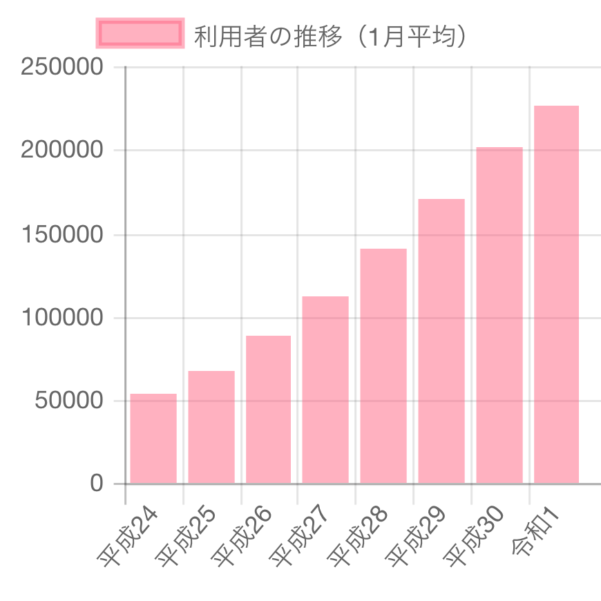 上記のグラフからもわかるように、放課後等デイサービスの利用者数は平成24年から年々増加しており、令和1年にはその数は約4倍になっています。このデータからは、障がいのある子ども自体が増えていることも読み取れます。