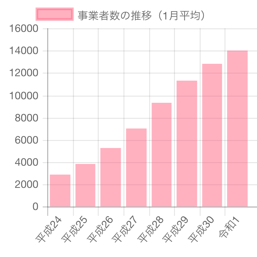 利用者数が増えていることから、事業所数も同様に平成24年から右肩上がりに増加しています。令和1年には事業所数は約14,000か所になり、平成24年の約7倍です。