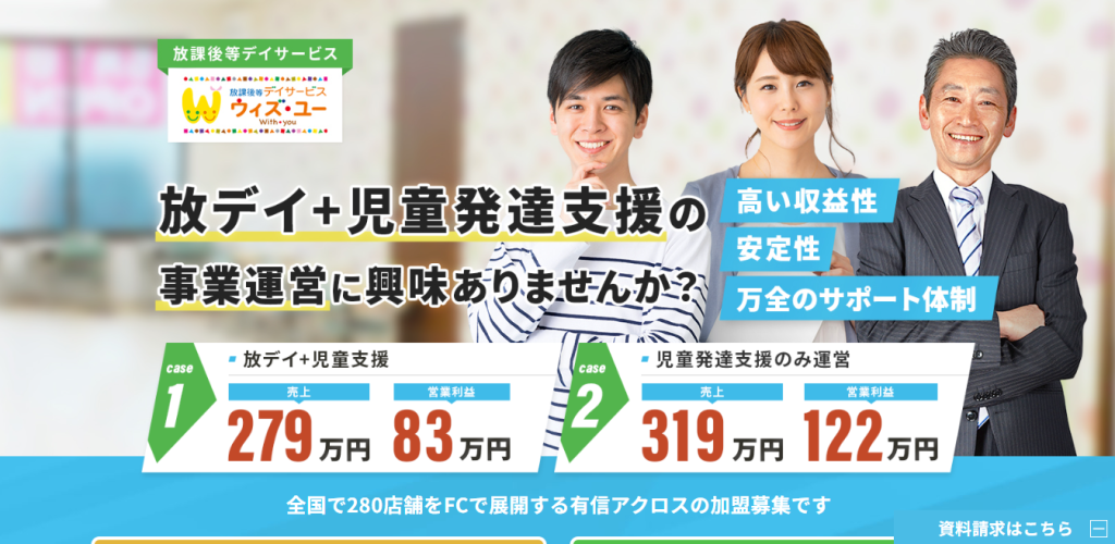 児童発達支援と放課後等デイサービスの複合施設を開業できるウィズ・ユーは、0歳から18歳と幅広い年齢層の子どもに対応可能となっているため、利益が出やすく安定した経営を期待できます。
