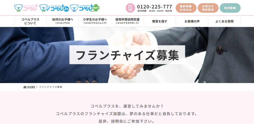 事業を始めるための書類作成はもちろん、現場ノウハウの指導・広報活動サポート・管理者育成・新人教育など、開業前から開業後に至るまでの手厚い支援が魅力です。