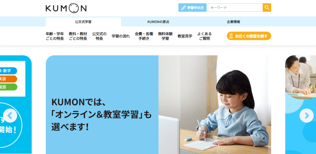 全国に教室を展開している公文は、知名度が高く幅広い年齢層の子どもが利用しています。公文式学習は「やればできる」という自己肯定感を高め、自ら挑戦するという強いやる気を培い、可能性の追求を目指す教育です。