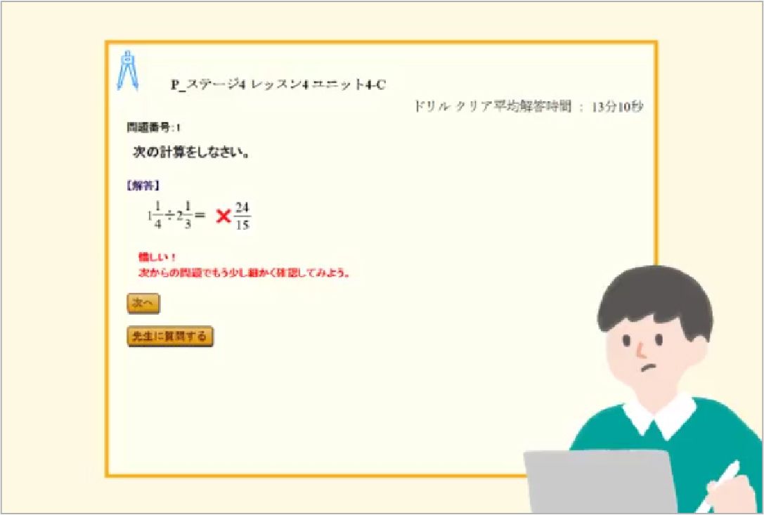 更に解答からつまずきの原因を特定し、つまずき原因に自動的にさかのぼり学びなおします。
