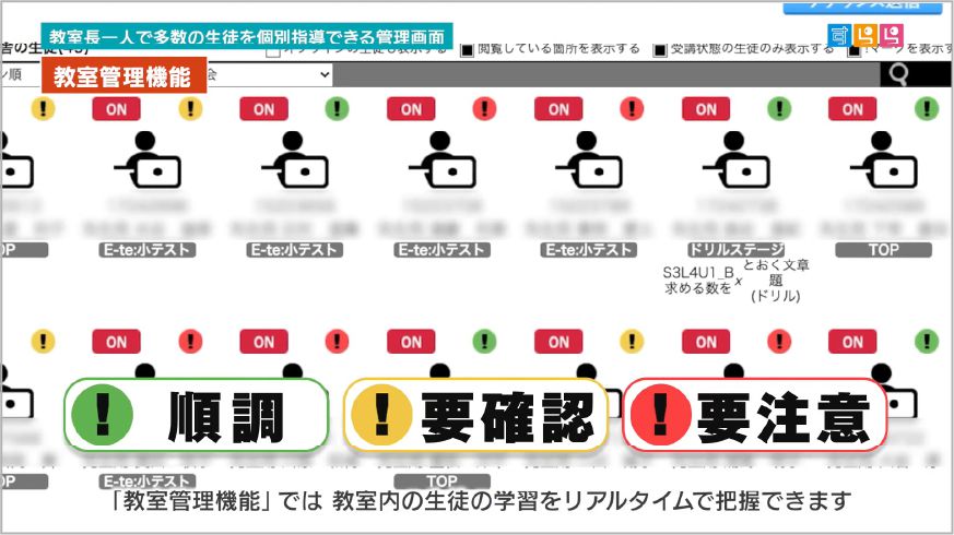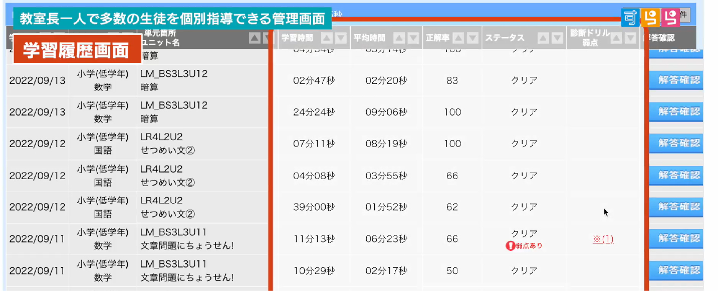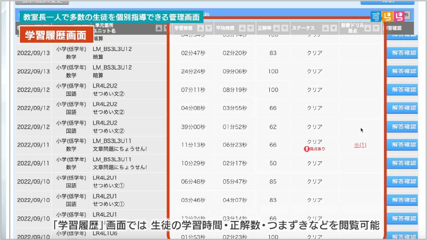 また、個別指導では児童生徒ごとに取り組んだ学習履歴を1問単位、更に正確に言えば1分1秒単位で管理することができるため、つきっきりで横で見ていた場合よりも詳細に学習状況を把握し、手厚いフォローを行うことが可能です。