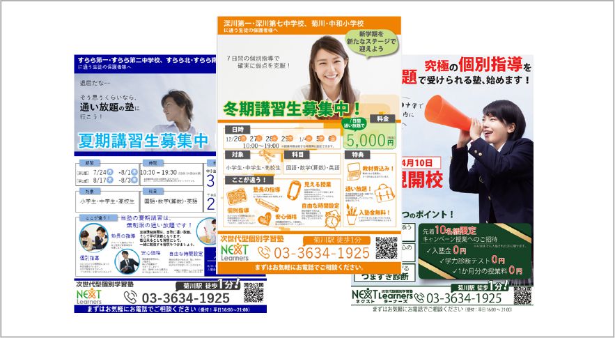 チラシの雛形が欲しい、というお声にお応えして、実際に反響のあったチラシをベースに、チラシの雛形をご提供しております。新規開校、各種季節講習、イベント等、お使いになるタイミングに合わせて、ぜひご活用ください。