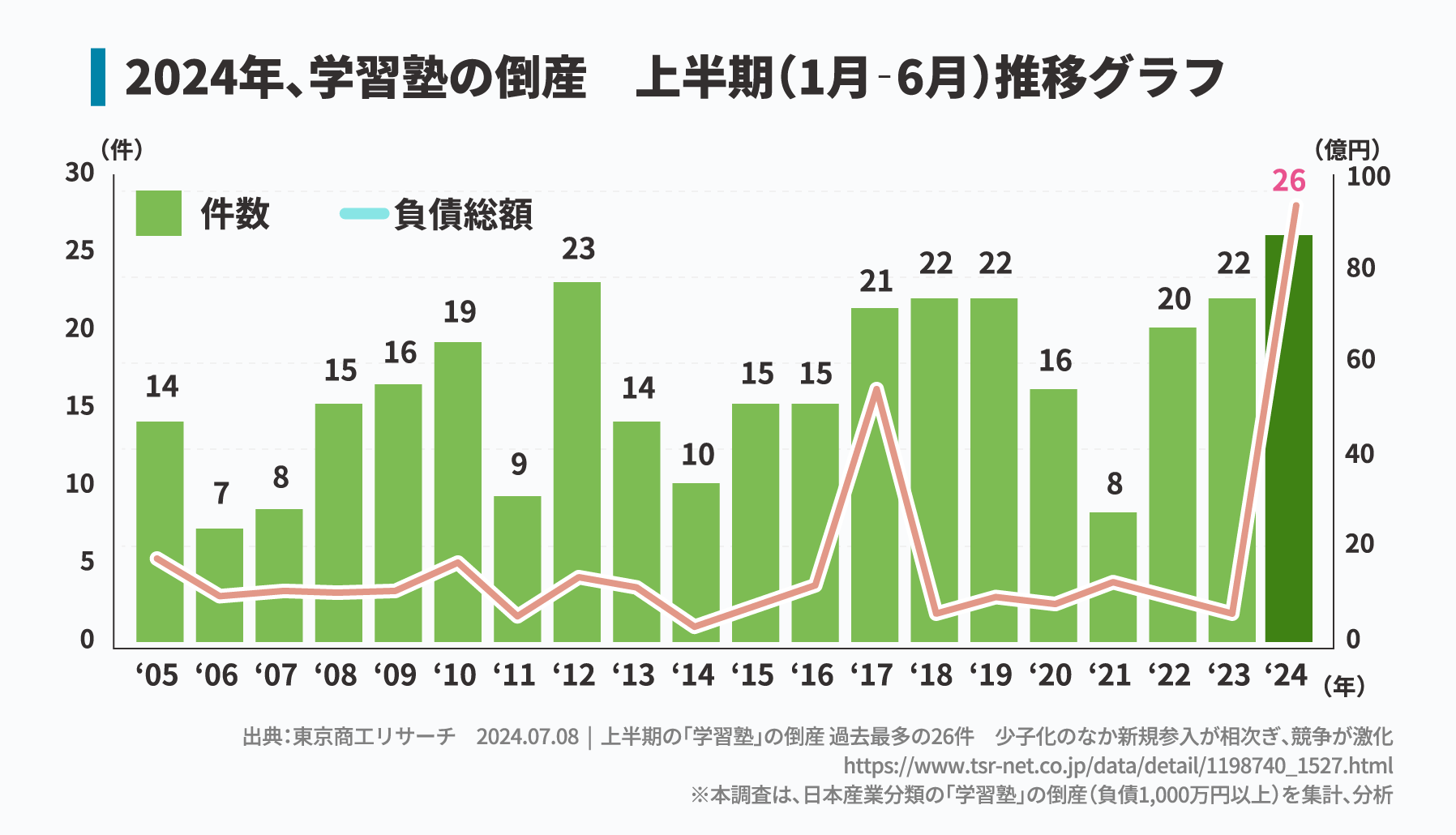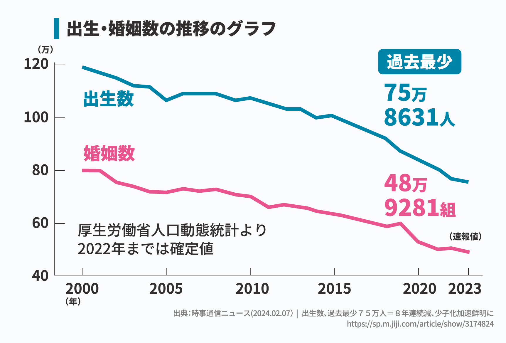 厚生労働省が2023年の年間出生数を75万8631人と発表し、8年連続で過去最少を更新しました。1983年の約150万人から半減し、政府予想よりも10年早く80万人を割り込む事態となりました。婚姻数の減少などが少子化の加速に拍車をかけており、今後の学習塾業界への影響が懸念されています。