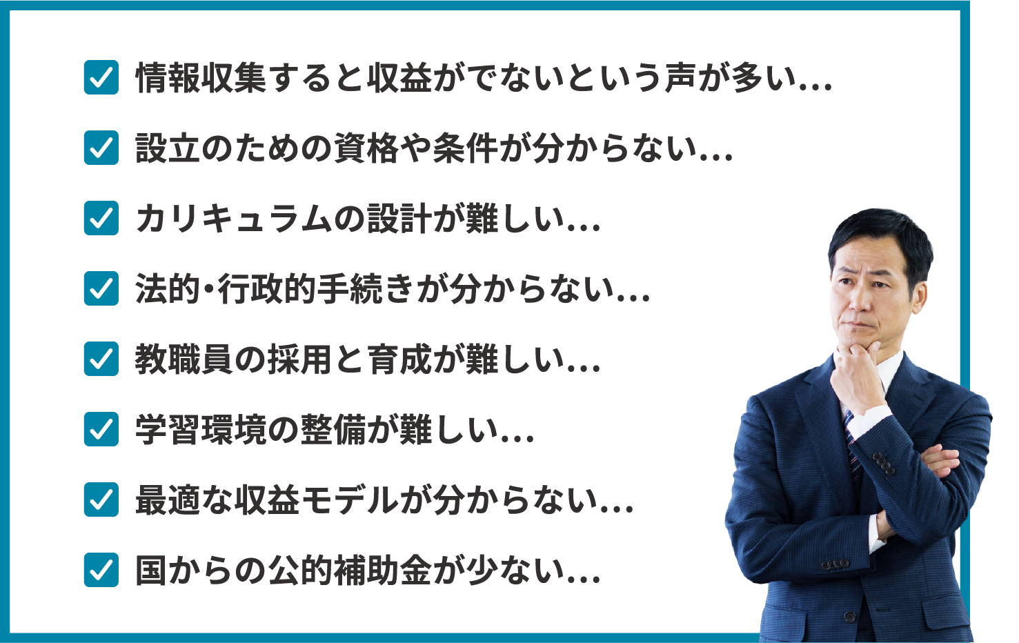 フリースクール開設に向けて、お客様の資金調達や物件探索に関するご相談はもちろん、お客様のご状況に合わせて開設プランをご提案させていただきます。
