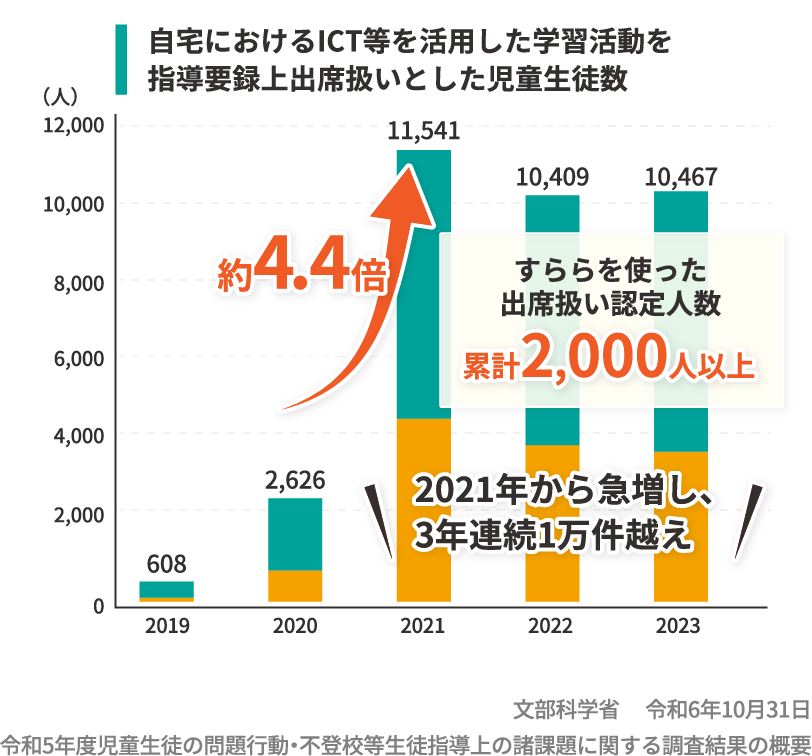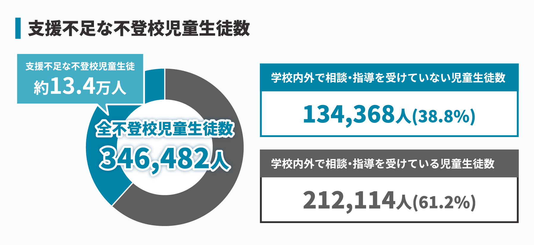 ここ10年間で不登校児童生徒数の数は急増し、現在34万6482人に達しています。これは前年から約4.7万人増加しており、深刻な状況です。しかし、フリースクールの数はこの増加に追いついておらず、多くの不登校児童生徒が適切な支援を受けられない状況です。