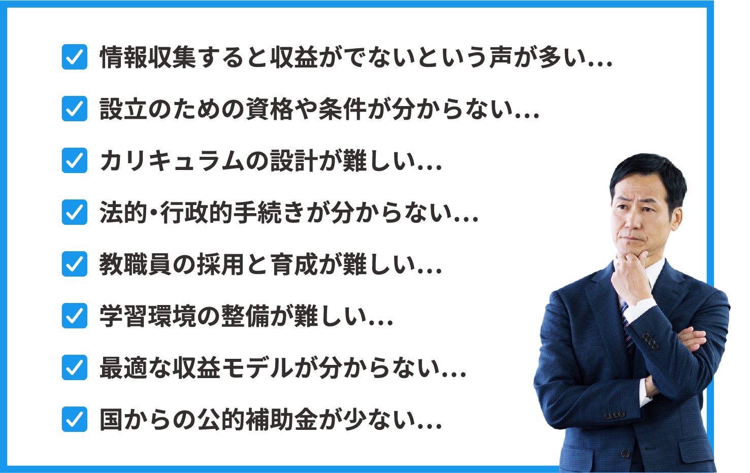 フリースクール開業に向けて、お客様の資金調達や物件探索に関するご相談はもちろん、お客様のご状況に合わせて開業プランをご提案させていただきます。