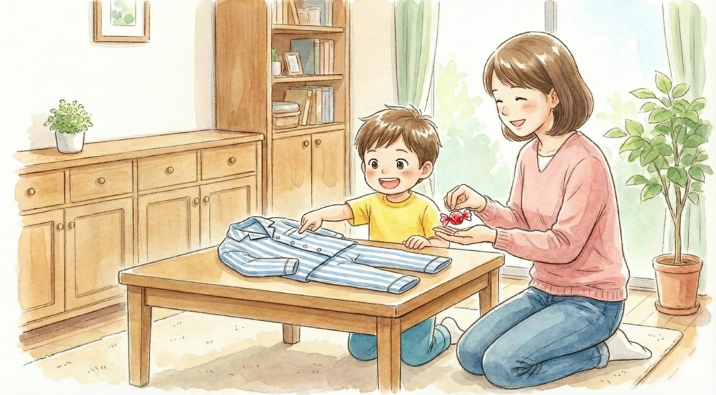 やっぱり罰の与え方とか、「スペシャルタイム※」の時間をとるのが難しかったです。でも、そのたびにメンターさんに相談するとすぐ返答をもらえたので、安心感がありました。参加者同士のやりとりも参考になって、少しずつ形になっていった感じです。朝の着替えができたら飴を1つ、というルールを取り入れています。最初は「全部着替えができたら1個」としましたが、途中で飽きたり、ご褒美ねだりがエスカレートしてしまったので、今は子どものやる気持続と私のOKできる範囲とで歩み寄り、今は「途中で1個」、「最後までできたらもう1個」と、無理のない形に落ち着きました。