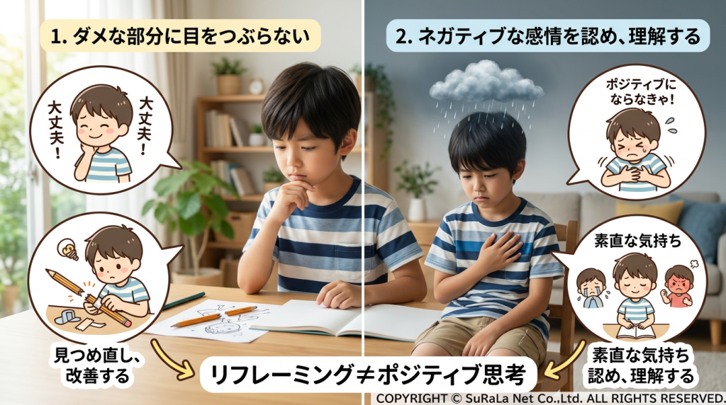 2つ目は、ネガティブな感情は押し殺せばよいものではないということです。リフレーミングではまず自分が何で苦しんでいるのか枠組みを理解し、ネガティブな感情を認めることからスタートします。ポジティブになることばかりを心掛けていると、自分の素直な感情を押し殺している状態になり、ますます苦しさを感じるでしょう。「リフレーミング≠ポジティブ」と理解することが大切です。