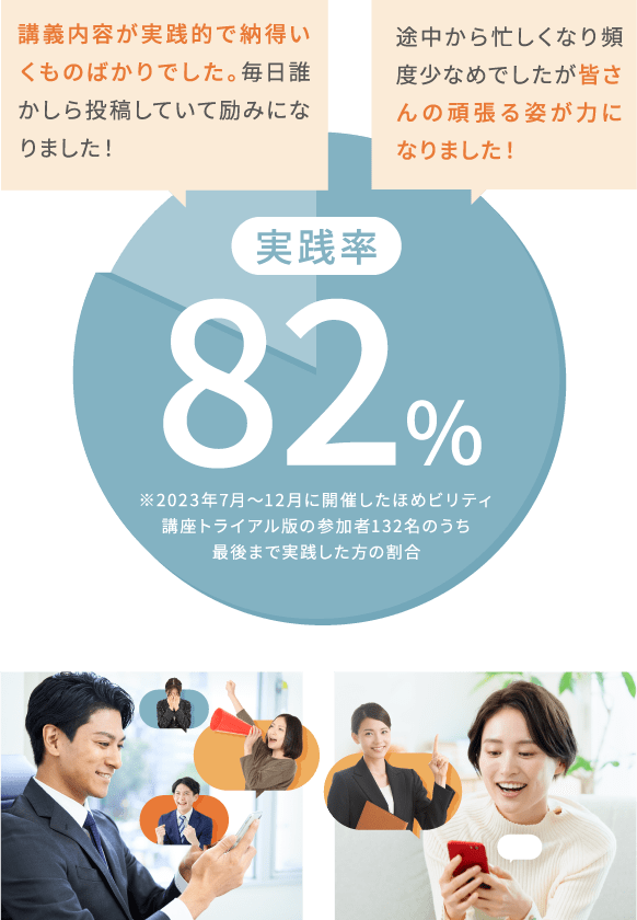 高い実践率の秘密はオンラインコミュニティ。参加する先生方でチャットグループを作り孤独を解消、実践する中で出てくる疑問はメンターが寄り添いながらフィードバックを行います。
