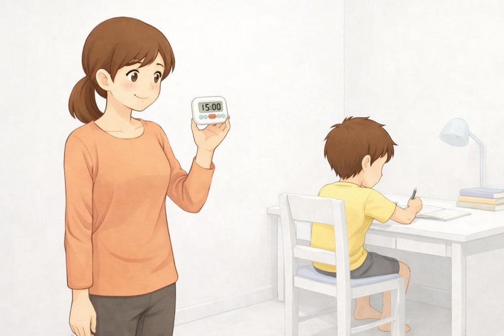 子どもの特性上、長時間の集中が難しいので時間で区切って少しずつ進めるようにしていましたが、以前は休憩時間が長引いて、なかなか勉強に戻れないことが多くありました。そこで、気持ちの切り替えがしやすいようにタイマーを使い始めました。「あと5分ね」と時間を決めて、ピピピっと鳴ったら「もうなったよ」と声をかけると、子どもは自分から勉強に戻れるようになりました。以前はタイマーが鳴っても勉強に戻ることが難しかったので、こんなにも変わるのかと私自身も驚いています。