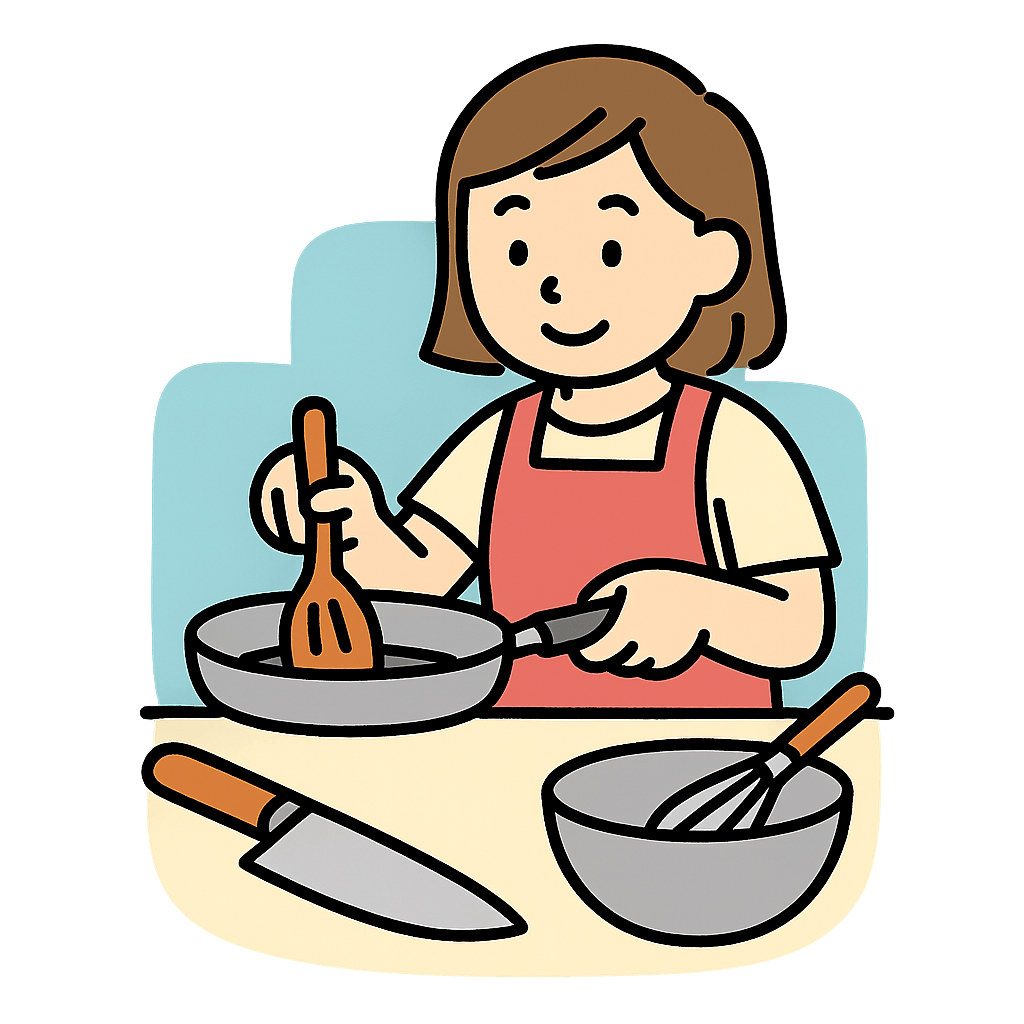 料理に必要な道具を使う(つかう)。