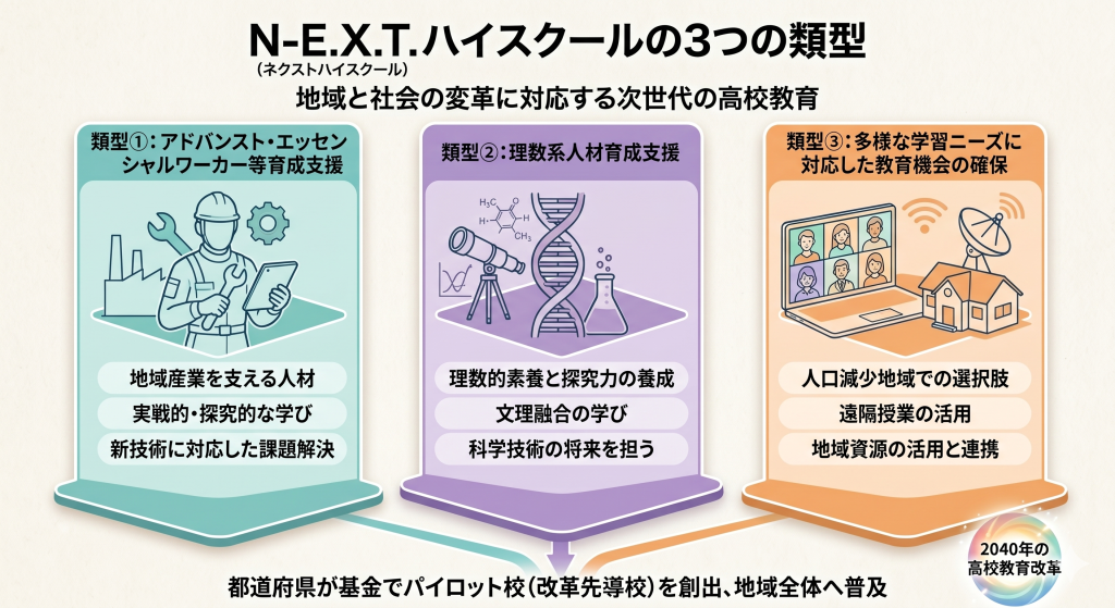文部科学省の資料によると、ネクストハイスクール構想では地域の課題や学校の特性に応じた支援を行うため、3つの類型が提示されています。それぞれの類型が目指す教育の方向性と役割について解説します。
