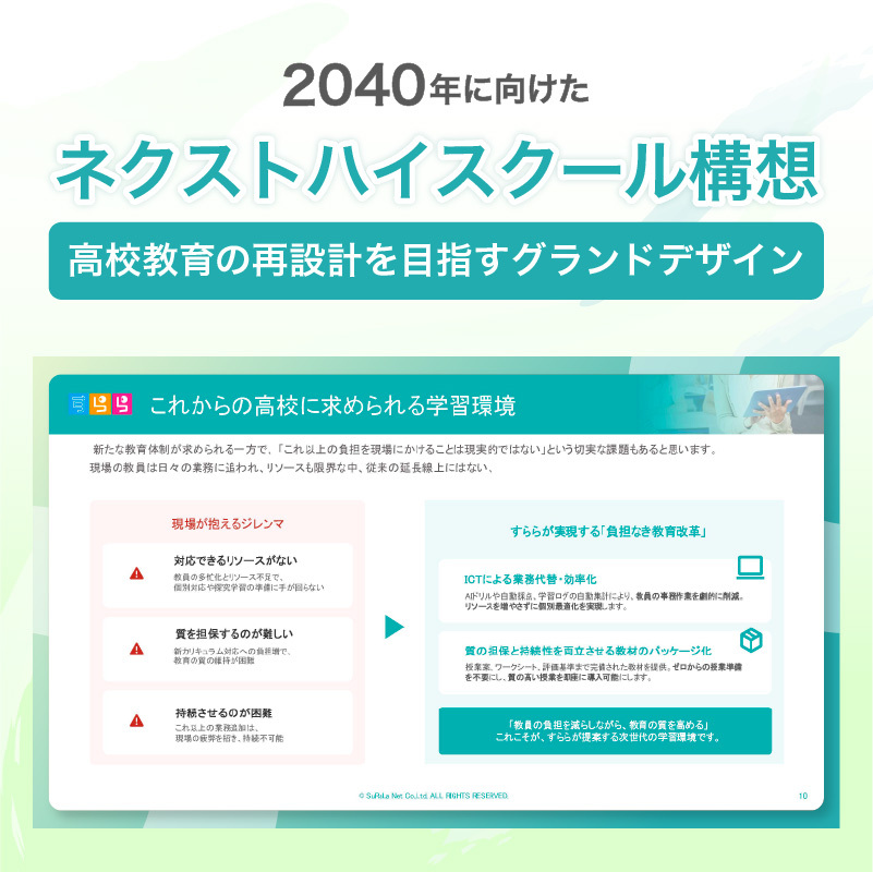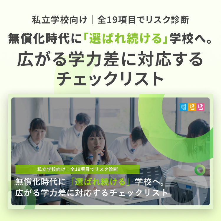 私学無償化により多様化する生徒の学力層に対し、貴校の受け入れ態勢が整っているかを5つの観点で診断できる資料です。「仕組み」で解決する3年後の未来に向けたヒントを掲載しています。