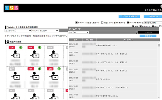 管理画面上で生徒が学習している箇所や取り組み状況をリアルタイムに把握することができ、生徒の頑張りやフォローが必要なタイミングを逃さずに学習を支援することができます。また、クラスごとや生徒ごとにメッセージを配信することもできますので、生徒たちの学習のモチベートに活用していただくことができます。