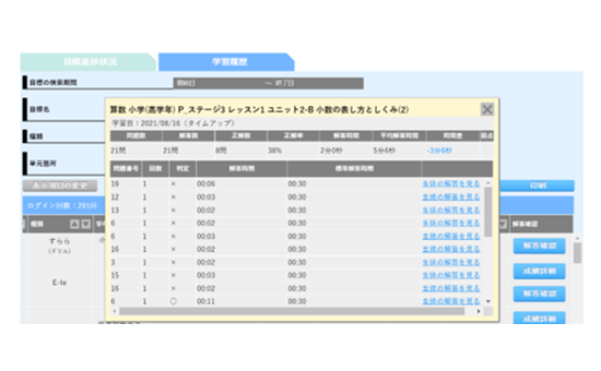 先生から配信された課題の進捗や、生徒が自主的に取り組んだ学習の履歴を確認することができます。学習した単元や学習にかかった時間はもちろん、単元・問題ごとの正答率や問題を解く中で発見された生徒一人ひとりの弱点などを確認し、日々の学習指導に活かすことができます。