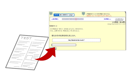 E-teエディター機能により、「すらら」内で先生方のオリジナル問題を作問・出題でき、ペーパーテストの電子化、採点の手間の削減、テスト結果をクラウド上で管理することができます。また、選択式の問題や並び替え式の問題等の多様な出題形式にも対応しており、様々な場面・目的で活用することができます。